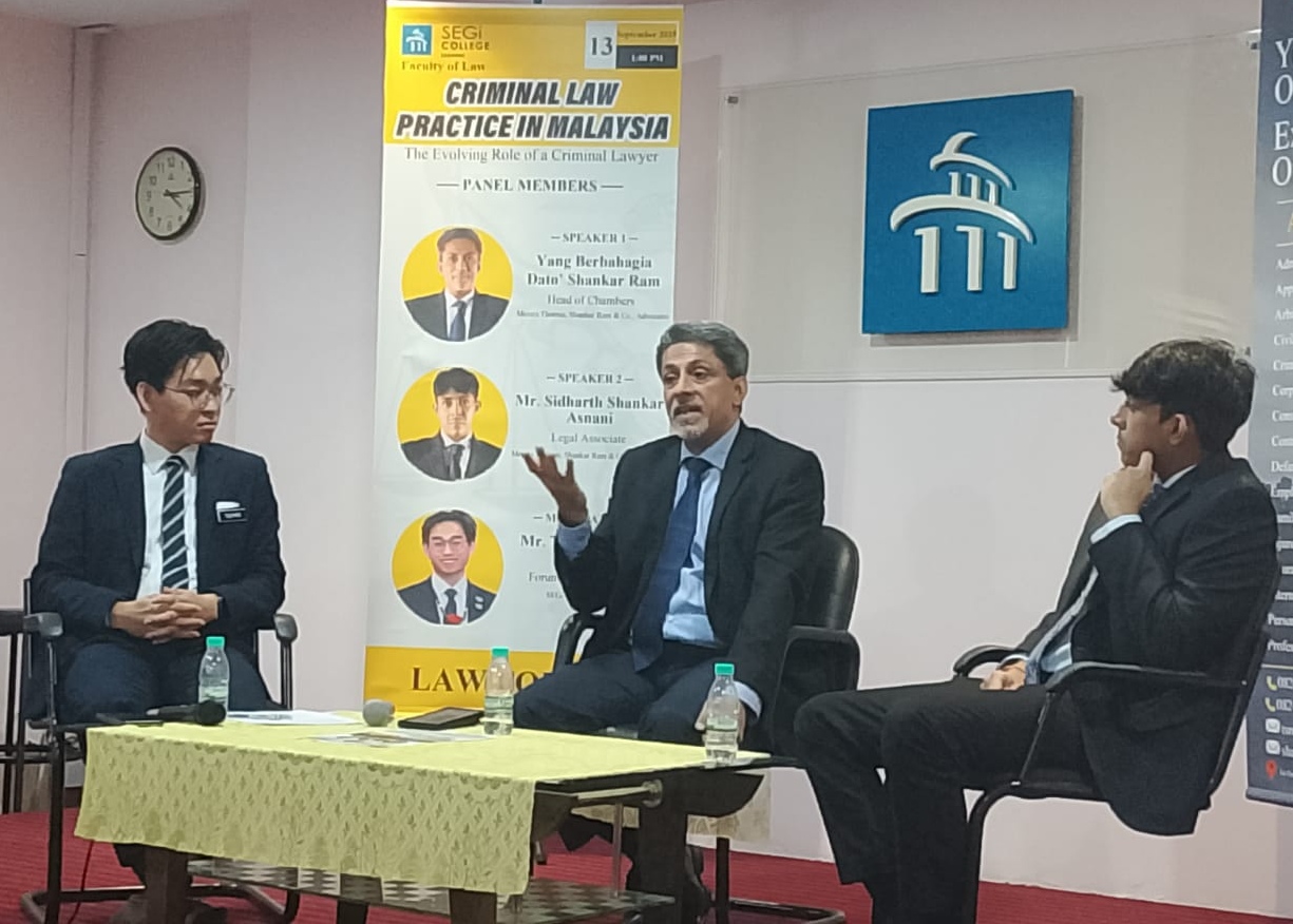 SEGi College Sarawak’s Faculty of Law hosted a thought-provoking forum on 13 September 2025 titled “Criminal Law in Malaysia: The Evolving Role of a Criminal Lawyer”, featuring distinguished practitioners from Thomas, Shankar Ram & Co. Advocates. The session brought together over 40 students and lecturers to engage with YBhg. Dato’ Shankar Ram, Head of Chambers, and Sidharth Shankar Asnani, Legal Associate, in a dynamic dialogue moderated by Chief Organiser Telford Engan Tan.