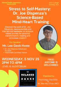 SEGi Subang Jaya held an inspiring Mental Health Awareness Month session titled Stress to Self-Mastery: Dr Joe Dispenza’s Science-Based Mind-Heart Training, led by Lee Geok Hwee, a HeartMath Certified Trainer and advanced student of Dr Joe Dispenza’s programmes.
